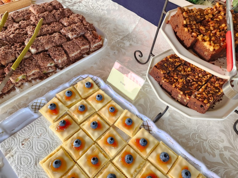 λ–‘κ³Ό νœ˜λ‚­μ‹œμ—, μΉ΄λ‚˜νŽ˜, λΈŒλΌμš°λ‹ˆ, 크루아상, ν† λ§ˆν†  λ§ˆλ¦¬λ„€μ΄λ“œ, 컡과일, 였미자 음료, 달달ꡬ리 λ“± ν…Œμ΄λΈ”μ΄ λ¬΅μ§ν•΄μš”. κΏ€κΊ½!